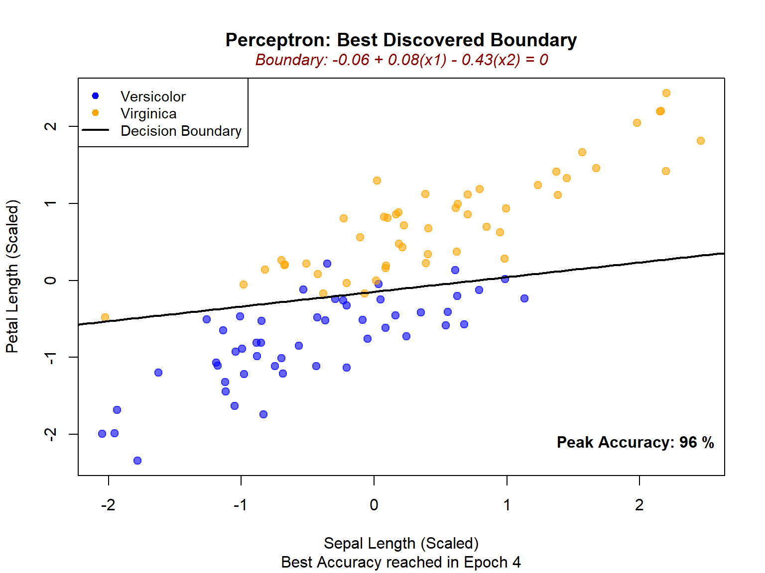 We observe 96% accuracy in Epoch 4, which means that at that specific point the model correctly classified 96 out of 100 points and only 4 points were misclassified (i.e., fell on the wrong side of the decision boundary).