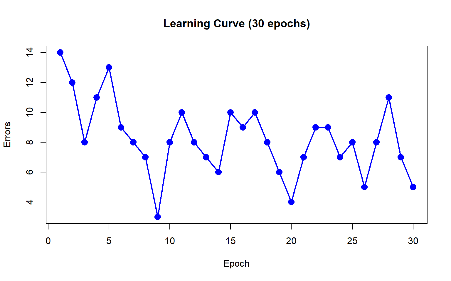main = "Learning Curve (30 epochs)", xlab = "Epoch", ylab = "Errors")