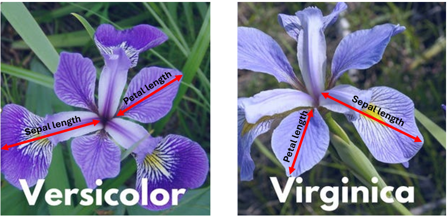 For this example, we’ll work with the well-known Iris dataset, one of the most commonly used datasets in machine learning. To simplify the task into a binary classification problem, we’ll focus on just two species: Iris versicolor and Iris virginica. Using the measurements of sepal length and petal length, we’ll explore how these features can be used to distinguish between the two species.
