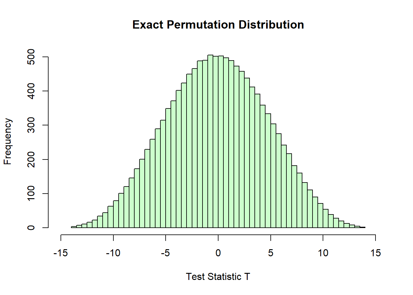 Finally, we create the histogram of the computed T statistics that is the exact permutation distribution. Each bar represents the number of times a particular range of \(T\) values occurs across all possible permutations of the data.